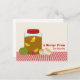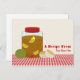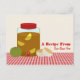 Ein Rezept-Postkarte mit einer Abbildung eines Dispensers mit rotem Deckel und einem mit süßem Tee und Zitronenkeilen gefüllten Spinnvlies. Grüne Tomate sitzt verlassen am Spender, 2 Kekse rechts. Personalisieren Sie mit Ihrem Namen.