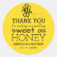 Dieses Brautparty oder Hochzeitsgast bevorzugen Geschenkmarke Aufkleber, hat ein Bild von einem gelben Wabenhintergrund. Ein niedliches Honigbienenbild und "Danke, dass du unsere Hochzeitssüße als Honig gemacht hast". Personalisiert mit den Namen der Braut und der Bräuche und dem Hochzeitstag. Fügen Sie zu einem mit hausgemachtem Honig gefüllten Maurerglas. Herzlichen Glückwunsch!