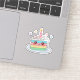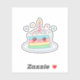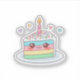 Zentriertes Druckdesign mit einer kawaii Flachillustration eines kleinen Regenbogenkuchenstücks auf einem Teller. Der Kuchen hat ein lächelndes Gesicht mit großen Augen und rosigen Wangen, belegt mit farbenfrohen Streuseln und einer kleinen Kerze.