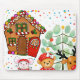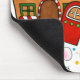 Whimsical Weihnachts-Mauspad mit einem kandiszucker-verzierten Lebkuchenhäuschen, einem einfach dekorierten Baum, einem lächelnden Teddybären, einer fröhlichen kleinen Maus und einem Renntier in einer hellen festlichen Szene mit farbenfrohen Konfetti-Punkten. Warme rote, grüne, goldene und pastellfarbene Töne geben diesem spielerischen Weihnachtsdesign ein süßes Bilderbuch-Look für saisonale Schreibtischdekoration.
