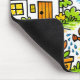 Fröhliches Mauspad mit einer skurrilen Doodle-Illustration eines lächelnden Mädchens, das Blumen in einem sonnigen Garten mit einem gemütlichen Haus, farbenfrohen Blüten, grünen Bäumen, Kürbissen, fallenden Blättern und einer glücklichen Sonne bewässert, perfekt, um jedem Schreibtisch einen spielerischen Cottage-Garten-Touch zu verleihen.