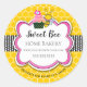 © 2021 Socialite Designs Inc. Niedliche und skurrile Honigbiene und Kuchen Design Aufkleber Vorlage. Der Designhintergrund ist mit einem lebendigen, gelben Wabenmuster-Hintergrund, einem schwarzen Polka-Dot-Band und einem eleganten Textbanner für Ihren Text ausgestattet.
