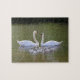 Schönes Foto von zwei stummen Schwänen mit sechs Zygnetten, die sich im Wasser entspannen.