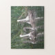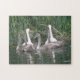 Dieses phantastische Rätsel zeigt ein wunderschönes Foto von erwachsenen Schwänen und ihren 4 Cygnets, die in der Ferne entlang eines ruhigen friedlichen Flusses schwimmen.