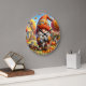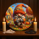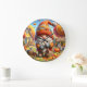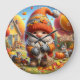 Diese bezaubernde Uhr besticht durch eine festliche Herbstszene mit einem großen, lächelnden Gnome, der einen Haufen gefallener Blätter überschwemmt. Er trägt einen rot-orange gestreiften Hut und einen gemütlichen orangefarbenen Pullover. Der Gnome ist von Kürbissen und Eichhörnchen-Ansammlung-Eichhörnchen umgeben. Im Hintergrund befindet sich ein gemütliches, gelbes Haus und ein Schild, auf dem steht "SWEATER WEATHER". Die Uhr ist Set vor einem Hintergrund von Herbstfarben, alle gerahmt in einem runden Rahmen.