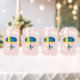 Bewundern Sie Ihr Erbe mit diesem stilvollen Dosenglas-Set mit einem Baum mit Wurzeln Silhouette mit der Flagge von Schweden füllen und "Schwedische Wurzeln" gekrümmten oberen Text auf hellgrauem Hintergrund.