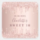 Für eine mädchenhafte und glamouröse süße 16, 16. Geburtstagsfeier. Eine Rose Gold Imitate metallisch aussehend Hintergrund mit Imitat Glitzer Tropfen, Farbe Tropfen aussehen. Personalisieren und fügen Sie Datum, Namen, Alter/Text hinzu. Der Name ist in dunklem Rose Gold mit einem modernen handgeschriebenen Stil geschrieben. Für Geschenkverpackungen, Favoriten oder "Save the Date" Erinnerung für die Gäste.