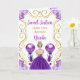 Diese 16 . Geburtstag Geburtstagskarte lädt mit einem eleganten Goldrahmen, einer hübschen Prinzessin mit blondem Haar und einem lila Kleid, Blume und einem Ballon ein.