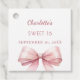A white background color. Decorated with a large pink bow. Personalize and add the name and date.