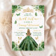 Celebrate her milestone in style with this elegant Sweet 16 invitation featuring a blonde girl in a sparkling green ball gown, viewed gracefully from the back. Surrounded by soft florals, fluttering butterflies, and a regal golden crown, the design blends youthful charm with royal sophistication. The color palette includes emerald green, shimmering gold, and soft leafy greens—perfect for spring or summer celebrations. Ideal for princess-themed parties, this invitation sets a magical tone for an unforgettable evening.