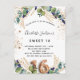 Für eine süße 16, 16. Geburtstagsfeier. Weiß, mit Eukalyptusgrün und goldenen Blätter dekoriert. Golden Imitats Glitzer Spots. Personalisieren und fügen Sie Ihre Namen und Hochzeitsdetails. Schwarze und goldfarbene Buchstaben. Nummer 16 wird mit Schriftart im Ballonstil geschrieben. Zurück: weißer Hintergrund und goldene Imitate Glitzer Flecken, Postkartendesign. Tipp: Wenn Sie es nicht so gewollt haben, dass es wie eine Postkarte aussieht, klicken Sie auf Anpassen, gehen Sie auf die Rückseite und entfernen Sie den Trenner und posten Sie die Briefmarke.