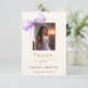 Eine moderne und elegante Sweet 16 Dankeschön Karte. Weiche, cremefarbene Unterlage mit einem großen Lavendelbogen. Schwarze und goldene Buchstaben. Auf der Vorderseite den Text: Danke, Name und ein Datum. Fügen Sie ein Foto hinzu. Zurück: Vorlage für Ihren Dank Notiz und Name.