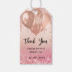 Eine Rose Gold und rosa Farbverlauf Hintergrund auf der Vorderseite. Mit Imitaten Rose Gold Glitzer Tropfen und Ballons als Dekoration. Auf der Vorderseite ein handgeschriebenes Stil Skript und den Text: Danke. Personalisieren und fügen Sie einen Namen/Text und ein Datum ein. Zurück: Platz für Sie, um mit der Hand zu schreiben.