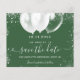 Eine gmädchenhafte und trendige Save the Date-Karte für eine Sweet 16, 16. Geburtstagsfeier. Jäger mit grünem Hintergrund. Dekoriert mit Imitaten silberner Glitzer und weiße Ballons. Der Text: Save the Date ist mit einem großen angesagten, handgeschriebenen Stilskript geschrieben.