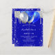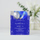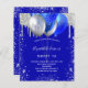 Ein königlich blauer Hintergrund. Dekoriert mit Imitaten silberne Glitzer Tropfen malen Tropflook, Glitzern und Ballons. Personalisieren und fügen Sie einen Namen und Party Details hinzu. Der Name wird mit einem handgeschriebenen Stilskript geschrieben.