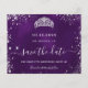 Eine gmädchenhafte und trendige Save the Date-Karte für eine Sweet 16, 16. Geburtstagsfeier. Ein lila, ungleicher Hintergrund. Dekoriert mit Imitaten silbernen Glitzer Staub und ein Tiara, Krone. Der Text: Save the Date ist mit einem großen angesagten, handgeschriebenen Stilskript geschrieben.