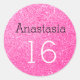 Sweet 16 runder Aufkleber mit glänzend rosa Glitzer Glitzern Hintergrund und Schwarz-Weiß-Schrift. Sie können es mit Ihrem Namen personalisieren und die Zahl für das Alter des Geburtstags ändern. Sie können sogar die Textfarbe und den Stil des Schriftartes mit der Option Anpassen ändern.