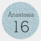 Sweet 16 runder Aufkleber mit einem glänzend blauen silberfarbenen Glitzer Glitzern Hintergrund und schwarz Schrift. Sie können es mit Ihrem Namen personalisieren und die Zahl für das Alter des Geburtstags ändern. Sie können sogar die Textfarbe und den Stil des Schriftartes mit der Option Anpassen ändern.