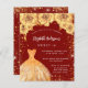 Eine moderne, stilvolle und glamouröse Einladung zu einer Sweet 16. Geburtstagsfeier. Roter Hintergrund mit Imitaten goldener Glitzer Staub, ein Kleid und goldene Rose, Blume. Der Name ist mit einem modernen handgeschriebenen Stilskript geschrieben. Personalisieren Sie Ihre Party-Daten und fügen Sie sie hinzu. 1 Blatt = 1 Einladung mit Druckkante bis Kante.