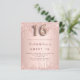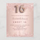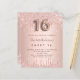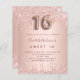 Eine moderne, stilvolle und glamouröse Einladung für eine Girl's Sweet 16, 16. Geburtstagsparty. Eine Rose goldener Hintergrund mit Tropfen, Farbe Tropfen aussehen. Der Name ist mit einer modernen dunklen Rose goldfarbenen handgeschriebenen Schreibschrift geschrieben. Personalisieren Sie Ihre Party-Daten und fügen Sie sie hinzu. Nummer 16 wird mit einem Schriftart im Ballonstil geschrieben, Skript.
