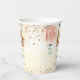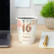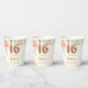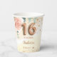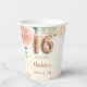 Für eine elegante Sweet 16, 16. Geburtstagsfeier. Weiß und goldfarben. Auf der Vorderseite und auf der Rückseite: Personalisieren und fügen Sie einen Namen und ein Datum. Die Rose ist mit goldfarbenen und rosafarbenen Blumen, Eukalyptusgrün dekoriert. Nr. 16 ist mit einem Schriftart im Ballonstil geschrieben.
