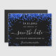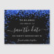 Ein schwarzer Hintergrund mit königsblauen Konfetti. Personalisieren und fügen Sie Datum und Name/Alter hinzu. Der Text: Save the Date ist mit einem großen angesagten, handgeschriebenen Stilskript geschrieben.