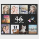 Für eine 16. Geburtstagsfeier für eine Frau, die ihr Leben mit einer Collage von 10 eigenen Fotos feiert. Foto von Familie, Freunden, Haustieren, Ferien. Vorlagen für einen Namen und das Alter von 16 Jahren und ein Datum. Weiße und graue Buchstaben. Eleganter schwarzer Hintergrund.