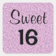 Sweet 16 quadratischer Aufkleber mit glam lila lila Glitzer Glitzern und fett schwarz schreiben.