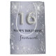 Elegant, klassisch, glamourös und mädchenhaft für eine süße 16. Geburtstagsfeier. Ein silberner metallischer Hintergrund. Dekoriert mit Staub aus Glitzer. Personalisieren und einen Namen hinzufügen. Mit dem Text: Happy Birthday. Der Name ist mit einem modernen handgeschriebenen Stilskript geschrieben. Nummer 16 wird mit einem Schriftart im Ballonstil geschrieben.