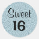 Sweet 16 runder Aufkleber mit glänzend blauen silbernen Glitzer Glitzern und fett schwarze Schrift.