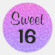 Sweet 16 runder Aufkleber mit einem glamourösen, lila Glitzer Glitzern Hintergrund und fett schwarze Schrift.