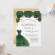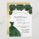 Eine moderne, stilvolle und glamouröse Einladung zu einer Sweet 16. Geburtstagsfeier. Auf der Vorderseite: Weißer Hintergrund mit smaragdgrünem Kleid und grünen Rose, Blumen. Der Name ist mit einem modernen handgeschriebenen Stilskript geschrieben. Personalisieren Sie Ihre Party-Daten und fügen Sie sie hinzu. Zurück: Imitate goldener Hintergrund.