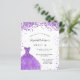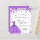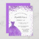 Eine moderne, stilvolle und glamouröse Einladung zu einer Sweet 16. Geburtstagsfeier. Auf der Vorderseite ein weißer Hintergrund mit violettem, lila Glitzern, ein violettes Kleid. Der Name ist mit einem modernen handgeschriebenen Stilskript geschrieben. Personalisieren Sie Ihre Party-Daten und fügen Sie sie hinzu.