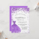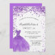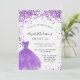 Eine moderne, stilvolle und glamouröse Einladung zu einer Sweet 16. Geburtstagsfeier. Auf der Vorderseite ein weißer Hintergrund mit violettem, lila Glitzern, ein violettes Kleid. Der Name ist mit einem modernen handgeschriebenen Stilskript geschrieben. Personalisieren Sie Ihre Party-Daten und fügen Sie sie hinzu.