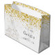 Eine Geschenktasche für einen gmädchenhaften und glamourösen Sweet 16, 16. Geburtstag. Ein stilvoller weißer Hintergrund mit goldfarbenem Glitzer-Staub aus Imitat. Personalisieren und fügen Sie Datum und Namen hinzu. Der Name ist mit einem modernen handgeschriebenen Stilskript geschrieben