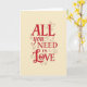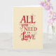 This greeting card shares a warm message with a mix of bold lettering and gentle detail. Centered on a soft cream background, the words “ALL you NEED IS LOVE” stand out clearly. “ALL” and “NEED” are written in strong red block letters that give the message weight and confidence. The words “you” and “IS” are shown in a thinner, flowing script, adding a more personal feel. Across the lower half, the word “Love” appears larger in red cursive, drawing the eye right away. A small red heart replaces the “o,” and delicate red swirls frame parts of the text. It’s a thoughtful card for sharing affection