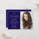 Dieses schlichte und stilvolle, dunkelblau-weiße jüdische Bat Mitzvah lädt mit einer Vintagen Schriftzeichen-Typografie und einem Imitat mit einem goldenen Stern von David mit Ihrem Foto ein. Ein elegantes, klassisches minimalistisches Design, das noch einzigartig und trendig ist.