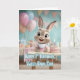 A happy baby bunny sits at her birthday table beside a pastel cake with a glowing candle, surrounded by balloons, gifts, and festive decorations. With bright, cheerful lettering that reads “Happy 1st Birthday, Sweet Baby Girl,” this adorable design captures the joy, innocence, and excitement of a baby girl’s first birthday celebration. A perfect choice for a fun and heartwarming milestone card.