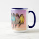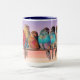 Die Vorderseite dieser Tasse zeigt eine Vintage Abbildung von kleinen, süßen Vögeln, die ich digital in einen farbenfrohen künstlerischen Stil nachgebaut habe, auf einem unterirdischen Hintergrund mit Sonnenuntergang. Das Innere des Bechers und des Griffs ist lila, aber der Griff und die Innenfarbe können auf Wunsch geändert werden.