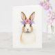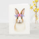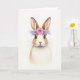 This card features a watercolor-style bunny centered on a bright white background, looking straight ahead with large, dark eyes that feel like a quiet, friendly hello 🐰. Its face and chest are snowy white, while the fur warms into ginger and caramel tones around two upright ears, with a soft pink blush visible inside. Fine whiskers fan out from a small rosy nose, adding a tender, close-up portrait feel. Resting on its head is a floral crown that suggests a sweet, affectionate mood, as if the bunny is dressed up for someone special 🌷. A pink rose sits near the top, surrounded by muted lavender leaves that curve gently with the shape of its head. The lighting looks softly diffused, with transparent washes that make the fur edges look feathery and light. Near the upper area, a short greeting appears in light pink lettering, leaving plenty of open space around the bunny and its rose-and-lavender crown.