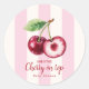 Celebrate the sweetness of a new arrival with these adorable "She's the Cherry on Top" baby shower stickers. Featuring a charming watercolor illustration of ripe cherries against a soft pink and white striped background, these stickers are a delightful way to add a special touch to your baby shower decorations. Use them to seal envelopes, adorn party favors, or embellish gift bags. This design captures the joy and excitement of welcoming a new baby, making it the perfect finishing touch for your celebration. Let these sweet cherries symbolize the precious little one who is the cherry on top of your world!