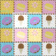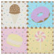 Befriedigen Sie Ihren süßen Zahn mit diesem farbenfrohen Muster, das schmackhafte Leckereien wie eine Schokoladeneismembran, einen lila mattierten Schokoladendonut, einen Zitronengelben Macaron, einen rosa und weiß wirbelnden Lollipop, getrennt von Schokoladenstückchen und umgeben von Regenbogensprinklen auf vier hellen Plätzen bietet.