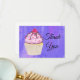 Eine Dankeschön-Karte mit einer Illustration eines köstlich aussehenden Kuchen. Rosa Zuckerguss und Schokoladentrizzles. Ein gelber Kuchenhalter und eine Himbeere oben. Ja! Der Hintergrund ist eine lila abstrakte Textur mit kleinen Herzen, die um sich gesprenkelt sind.