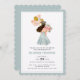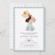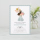 Dieses Graduierungsparty-Einladungs-Design beinhaltet ein Aquarellbild eines Mädchens mit dunkelbraunem Haar mit blauem Kleid und eine Graduierkappe, die Ballons, Blume und ihr Diplom aufrollt.