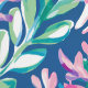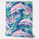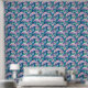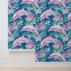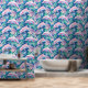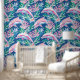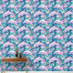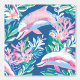 Ein nahtloses Muster mit weißen und rosa Delphinen, die in einem blauen Meer mit rosa und blauen Pflanze schwimmen. Das Design vereint eine pulsierende Unterwasserszene mit verspielten Delphinen und farbenfroher Wasserflora.
