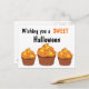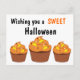 Auf den Postkarten gibt es 3 Halloween-Kuchen mit orangefarbenem Zuckerguss und Bonbonmais, auf denen oben steht, wünscht euch ein SWEET Halloween.