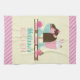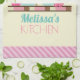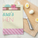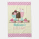 Personalisiertes Küchenhandtuch mit einem süßen Eis-Thema. Rosa diagonale Streifen entlang der oberen und unteren Grenze. Illustriert mit einer Schokoladeneis-Bar, 3-Scoop-Sonnenschirmen mit Kirsche oben und Erdbeerfloat mit Schlagsahne. Kleine Erdbeeren und Kirschen am Boden. Hellgelber Hintergrund. Erfrischende warme Leckereien.