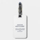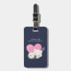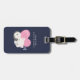 A luggage tag with an adorable graphic illustration. A white kitty cat with a cute paw print image on her fur. Sleeping peacefully. A big pink heart behind her and some little stars too. Dark blue background.