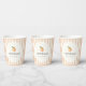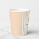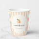 Niedliche "Sweet Small Peach" Thema Baby Dusche Papier Becher, mit einem pastellfarbenen pfirsichgestreiften Hintergrund und ein Vintages Drehbuch.