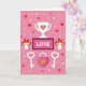 This Valentine's Day card shows a pink background filled with small white sparkles and tiny heart details that make the scene feel sweet and romantic 💕. In the center, there’s a bright white trophy with a pink-and-yellow heart on the front, like love is the top prize. Just below it, a framed sign says “LOVE” in simple, easy-to-read letters, with a dark magenta border around the word. On each side of the sign, two red mushrooms sit like little decorations, each topped with white heart spots. At the bottom, a pink heart-shaped padlock with a golden keyhole rests between two white keys, and each key has a heart shape at the top. The colors stay mostly pink, red, and white, keeping everything focused on romance and caring ❤️. Share it with someone special and let them know you’re thinking of them this Valentine’s Day 😘.